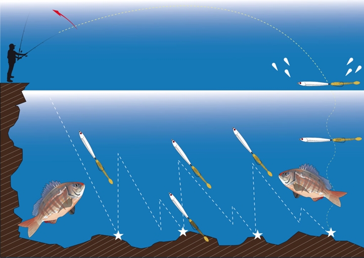 2) Sonra bir durun, bırakın kamışın ucu geri dönüş (kamçı) hareketini yapsın. Böylece jiginiz öncelikle yukarı doğru bir çıkış hareketi yapacaktır. Bu hareket jigin tipi ve denge durumuna göre değişir. Bazı jigler yanal yönde kayma hareketi yapar, bazıları etrafında döner, bazıları asılı kalır, bazıları ise bir tarafına doğru kaykılır. Ama sonuçta hepsi bir düşüş hareketi sergilerler.