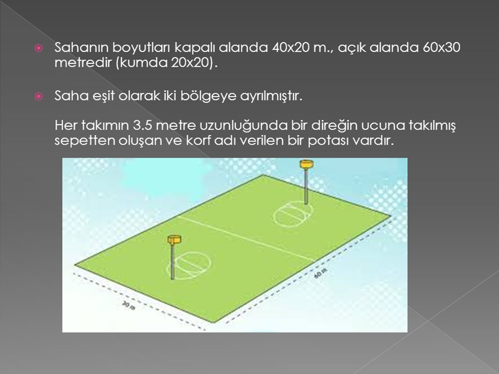 - Oyun Alanı ve Süresi: Korfbol sahası, genellikle bir kapalı spor salonunda veya dış mekanda belirlenmiş ölçülere sahip bir alan üzerinde oynanır. Bir maç genellikle iki yarıdan oluşur. Her yarı genellikle 20-25 dakika sürer, ancak bu süreler ulusal ve uluslararası kurallara göre değişebilir.
